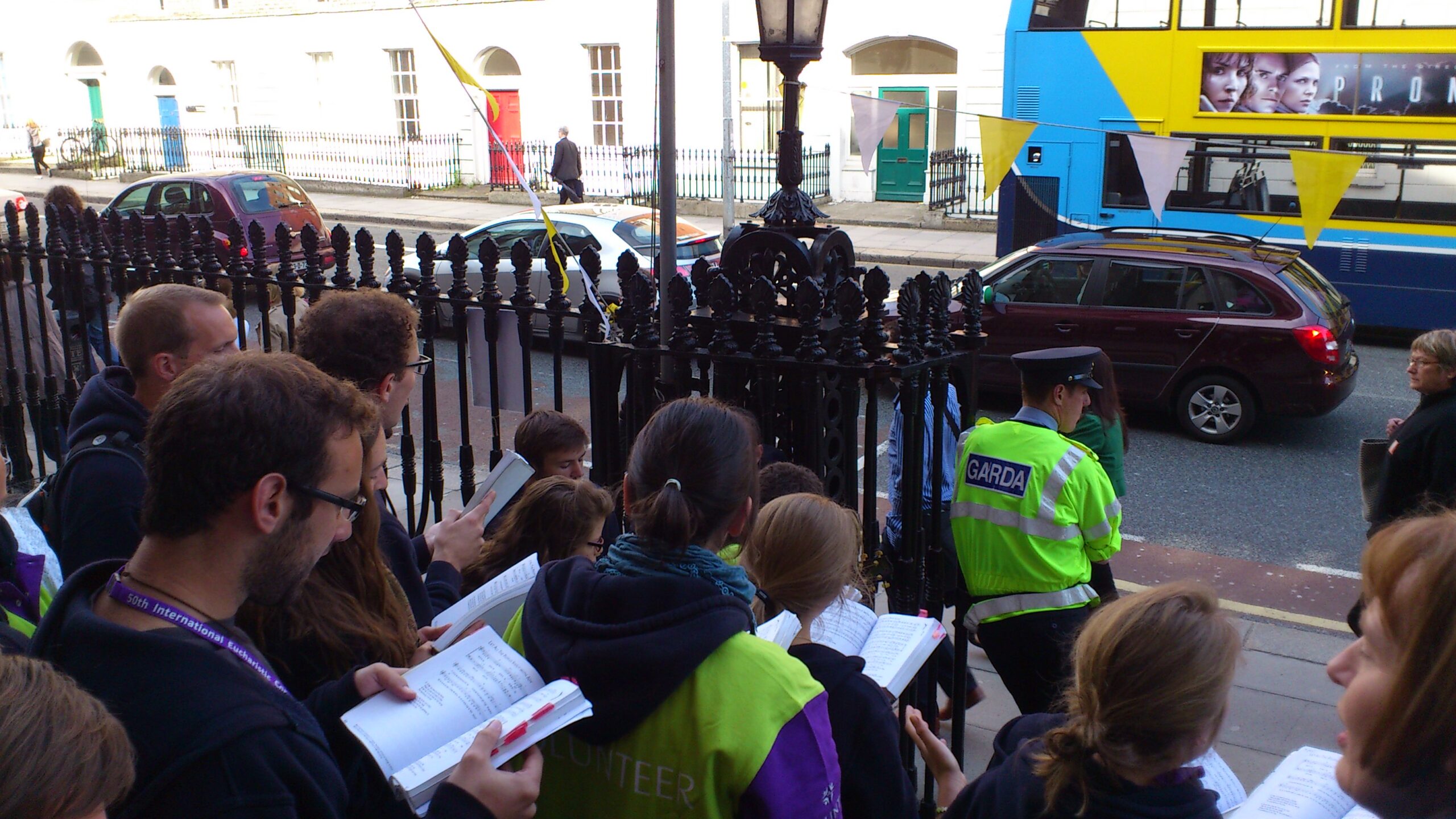 St. Andrew’s Church at Westland Row was the focus of a different kind of mission from June 10th-18th, a very vibrant City Mission during the week of the IEC! 6000 commuters pass by the well-known city church daily (which is close to Trinity College and next to Pearse DART Station). It was our objective to be joyful missionaries and reach out to as many people as we could, and complete with our distinctive IEC2012 Volunteer jackets we were certainly a visible presence of the ‘Congress in the City’, attracting much attention on Westland Row and the nearby shopping and business district including Grafton Street where we also evangelised. Each day we had praise (morning prayer) on the steps of the Church from 8am, as missionaries engaged in street evangelisation and personal contact with the many people walking to work on the streets. There were lots of interesting conversations each day, many scripture verses & cathechises booklets handed out, and prayer intentions offered for the people we encountered. We encouraged people to enter the church for Mass, Eucharistic Adoration or a time of personal prayer daily through uplifting music and by sharing the joy of our faith. There was evening Vespers at the Church, while later in the evening there was a different daily programme each day focusing on a different theme – God’s love, reconcilation, the Holy Spirit & the new movements of the Church, Sacred Heart of Jesus and the Immaculate Heart of Mary. Visits were made throughout the week to the local primary schools and some community initiatives/agencies of the Church.