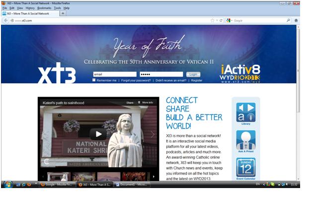 Glactar leis san eaglais uilíoch go bhfuil an t-idirlíon fíorthábhachtach i soiscéalaíocht na hóige. Dá réir sin, sheol an eaglais an chéad líonra sóisialta oifigiúil riamh – Xt3 (www.xt3.com) – roimh Lá Domhanda na nÓg i Sydney na hAstráile anuraidh. Is í an aidhm atá leis ná cuidiú le daoine óga dul i dteagmháil lena chéile d’fhonn níos mó eolais a fháil faoin gcreideamh Caitliceach, ceangal a dhéanamh leis an eaglais go ginearálta, agus a fháil amach céard atá ag tarlú ina gceantar féin. Baineann a Naofacht an Pápa Beinidict XVI úsáid as, fiú, agus sheol sé teachtaireacht chuig na baill go léir tar éis an cheiliúrtha i Sydney. Baineann ábhar Xt3 go hiomlán le daoine óga: líonraí, leabharlann alt, físeáin, podchraoltaí agus comhaid fuaime, nuacht, intinní, paidreacha, pobalbhreitheanna, agus tuilleadh. Ba mhaith leis an suíomh díospóireacht agus fóram plé a spreagadh, agus tá acmhainní ann ar nós féilire Charghais le paidreacha, léachtaí laethúla agus gearrthóga fuaime chun cabhair a thairisicint do dhaoine óga ar a n-aistear creidimh. Ní amháin sin, ach is féidir inneachar Xt3 a roinnt le do chairde ar Facebook agus ar lionraí cumarsáide sóisialta eile chun cuidiú le soiscéalaíocht na hóige.