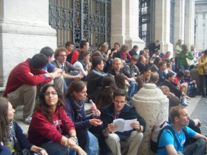 On Saturday 5th November we made the ‘Pilgrimage of the Seven Churches’ with the Centro San Lorenzo (the International Centre for the Youth). It was an experience which was thoroughly enjoyable and faith enriching and definitely one of the highlights of my time at the Emmanuel School of Mission so far. A group of about 100 young people (representing every continent in the world) met at 7am at St. Peter’s Basilica for Mass in the Crypt. It was a great privilege to be part of the celebration of the Eucharist in such a sacred place beside the tombs of Saint Peter, the rock of the faith, the Popes and great saints. We then had breakfast at the Centro before embarking on the long walk to Saint Paul’s Basilica, located outside the walls of Rome. Gathered around the great statue at the front of the Basilica, we reflected on the life of Saint Paul who penetrated so profoundly the mysteries of conversion of faith. From being a persecutor of Christians Saint Paul became a great missionary and fearless in proclaiming the Gospel in many lands. I left a candle at the flame (a mark of the year of Saint Paul, at the entrance to the Basilica) and prayed for the intentions of all those who have supported me for this missionary year. From there we walked to the Basilica of Saint Sebastian at the Catacombs. Saint Sebastian is one of the great Christian martyrs and while there we prayed for the courage, like Saint Sebastian, to give witness and testimony of the faith even in trying times. We had our packed lunch outside the Catacombs, and after each of us was given a Rosary beads blessed by Pope Benedict, we prayed the Rosary and reflected in silence for the next part of our walk.  Next we came to the Basilica of Saint John Lateran, the Cathedral of Rome and mother church of the Church, whose dedication we celebrate on November 9th. There we meditated on the mystery of the Church as a universal Sacrament of Salvation. The Basilica of the Holy Cross in Jerusalem which came next was a very special part of the Pilgrimage where we meditated upon the Cross of Christ, the great mystery in our faith. The church contains some relics traditionally linked to the Crucifixion of Christ, including parts of the ‘true cross’. As darkness descended we arrived at the Basilica of Saint Lawrence, outside the walls where we prayed to Saint Lawrence & Saint Stephen – two deacons that gave their testimony in Rome and Jerusalem. Finally, close to 7pm and twelve hours after we began our pilgrimage, we arrived at the Basilica of Saint Mary Major – the greatest of the churches dedicated to Our Lady and the only basilica that has preserved its original form. This was certainly one of the most blessed pilgrimages that I have ever undertaken. To be with the youth of the world undertaking this great pilgrimage, together meditating upon the lives of the saints was very special. Throughout the pilgrimage there were reflections from young people, seminarians, deacons, priests and lots of time to share the fellowship of one another, all gathered together in the eternal city on a mission for Christ.
